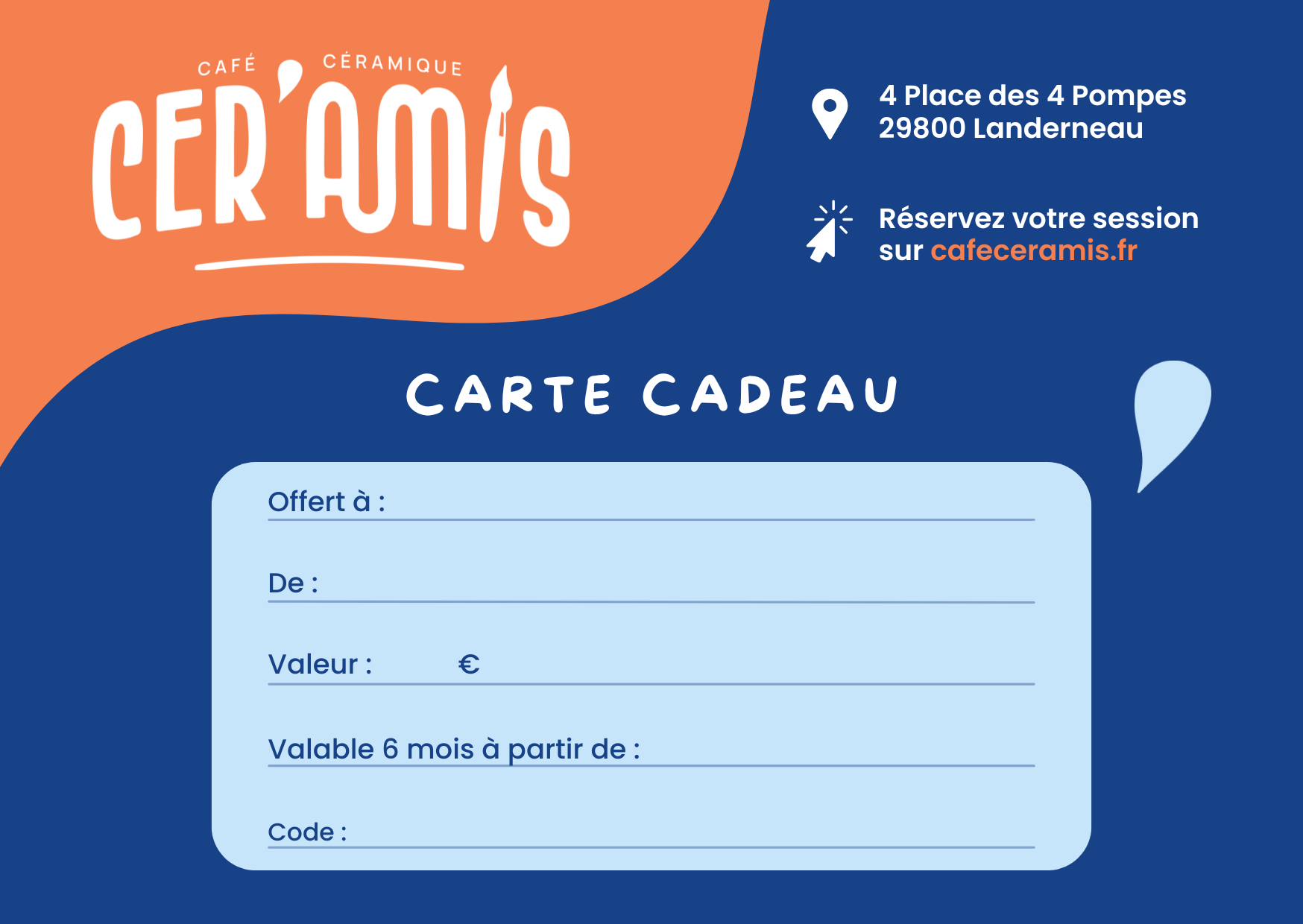 Offrez une expérience mémorable à la personne de votre choix et elle pourra décorer sa céramique en dégustant une boisson/un biscuit lors d’un atelier de 2h30.